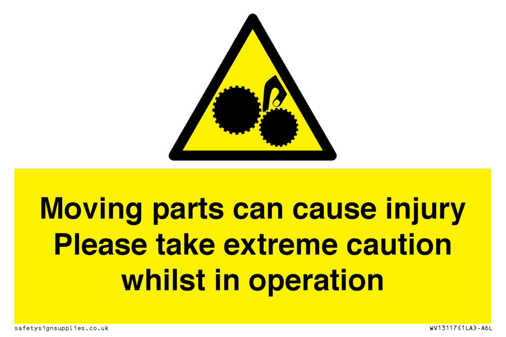 Sign Text: Moving parts can cause injury Please take extreme caution whilst in operation