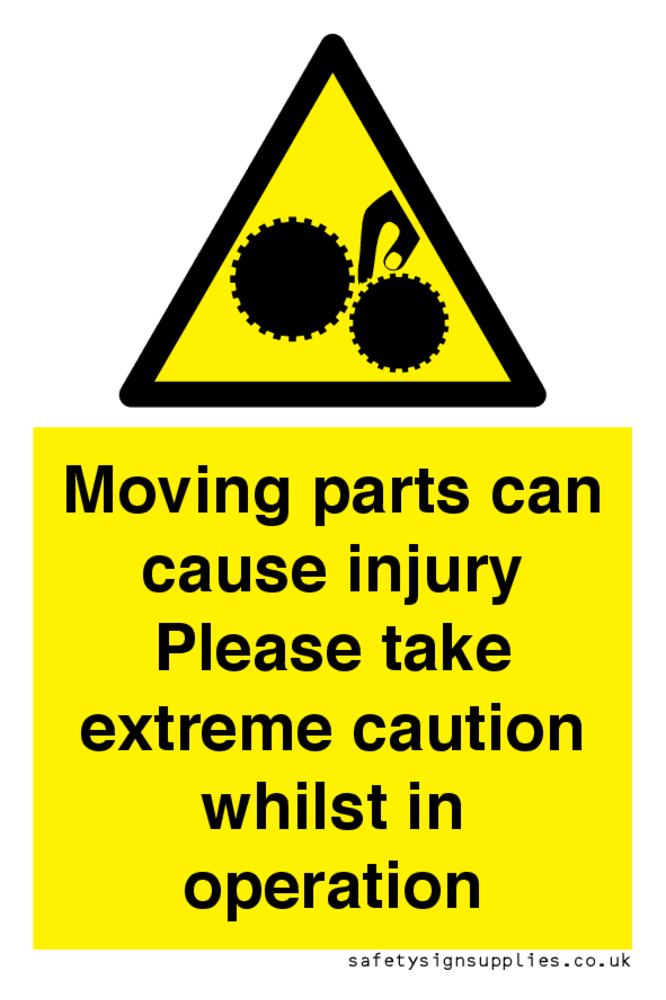 Sign Text: Moving parts can cause injury Please take extreme caution whilst in operation