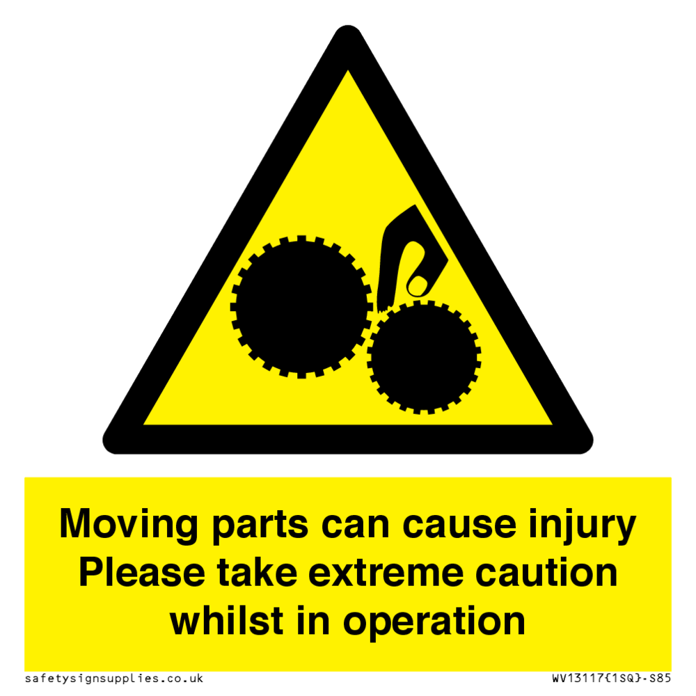 Sign Text: Moving parts can cause injury Please take extreme caution whilst in operation