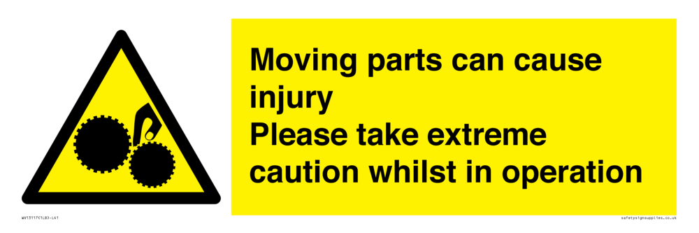 Sign Text: Moving parts can cause injury Please take extreme caution whilst in operation