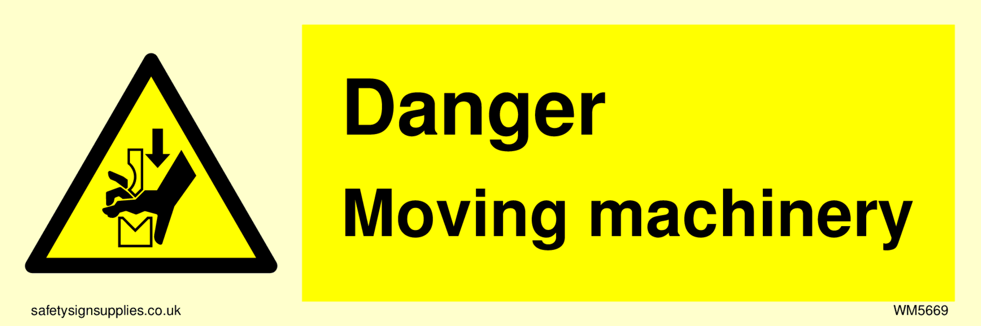 This sign contains a moving machinery / finger trap warning. Cogs with hand advancing towards pinch point in black on yellow warning triangle with black border.