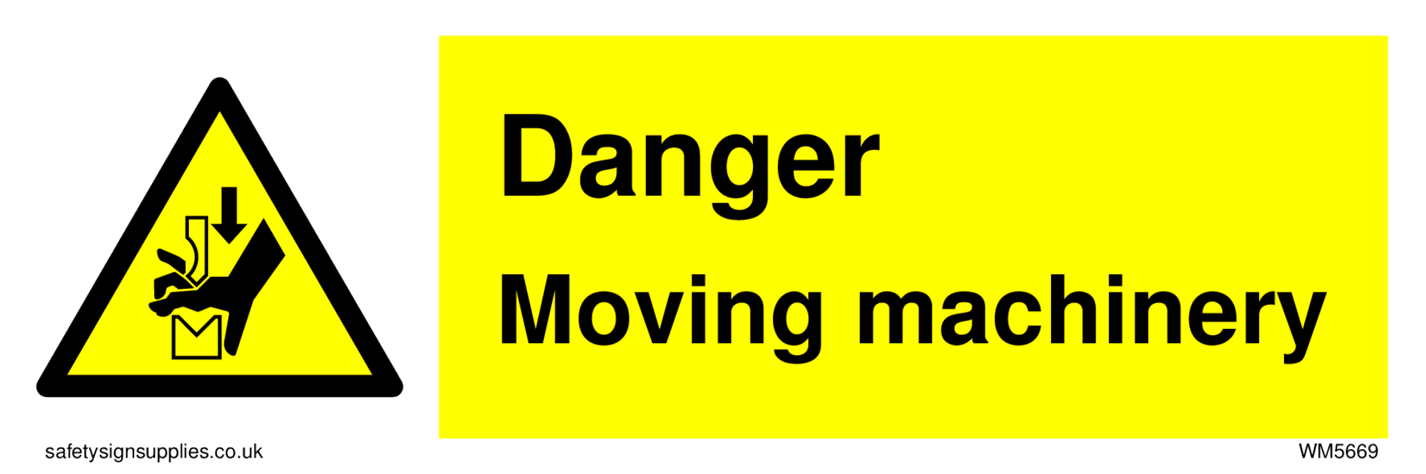 This sign contains a moving machinery / finger trap warning. Cogs with hand advancing towards pinch point in black on yellow warning triangle with black border. Suitable for fixing with screws.