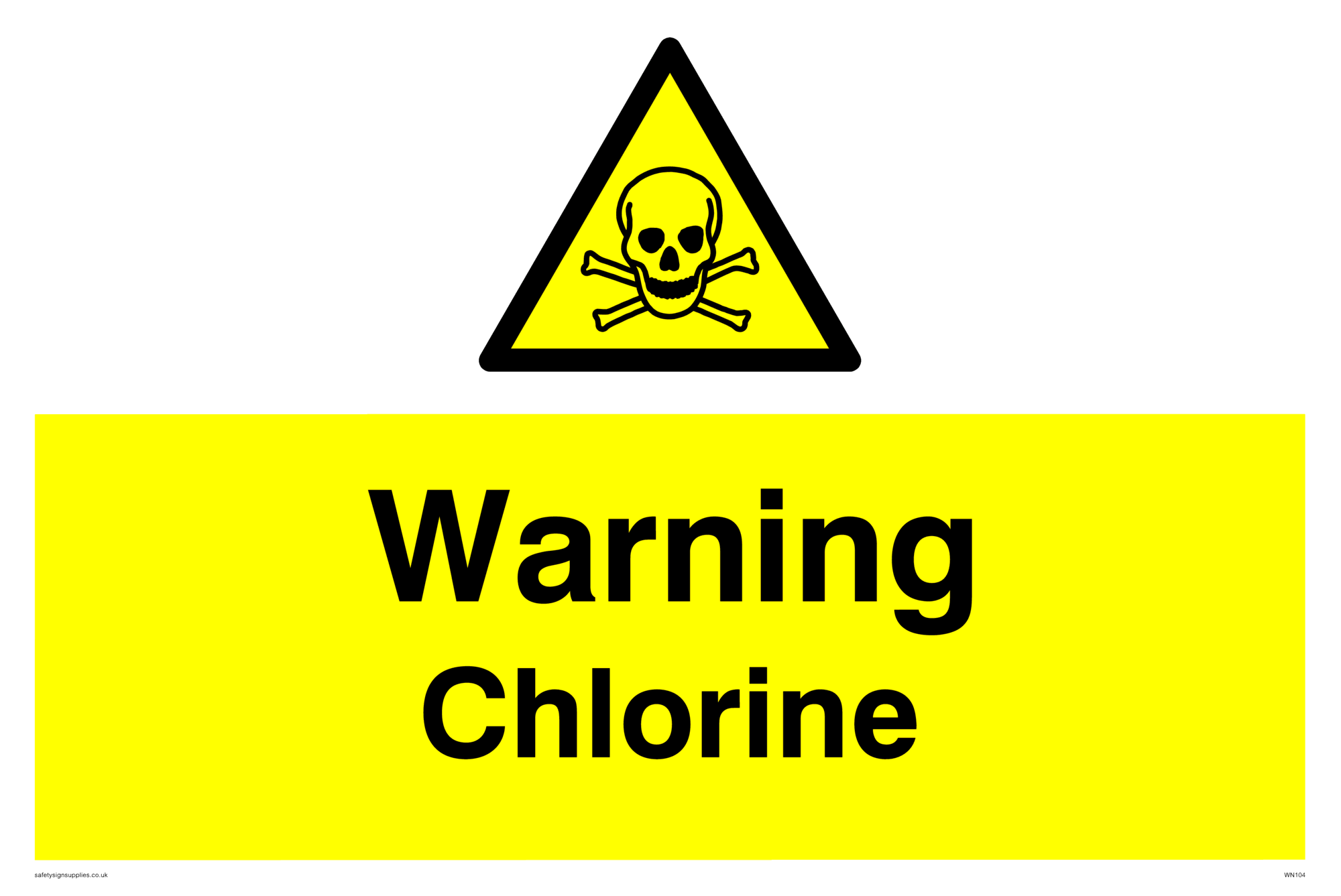 This sign contains an international standard toxic / poison symbol. Skull and cross bones in black on yellow warning triangle with black border.