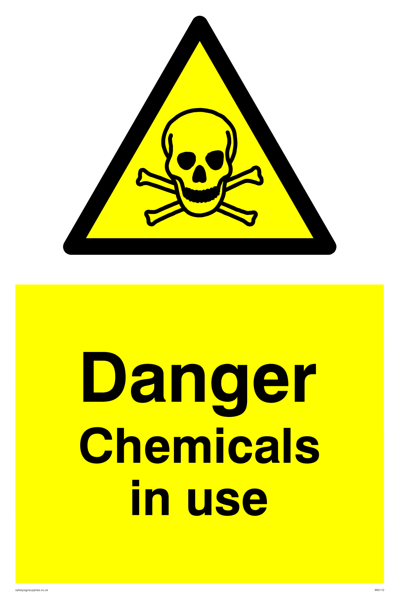 This sign contains an international standard toxic / poison symbol. Skull and cross bones in black on yellow warning triangle with black border. Comes with a self adhesive backing.