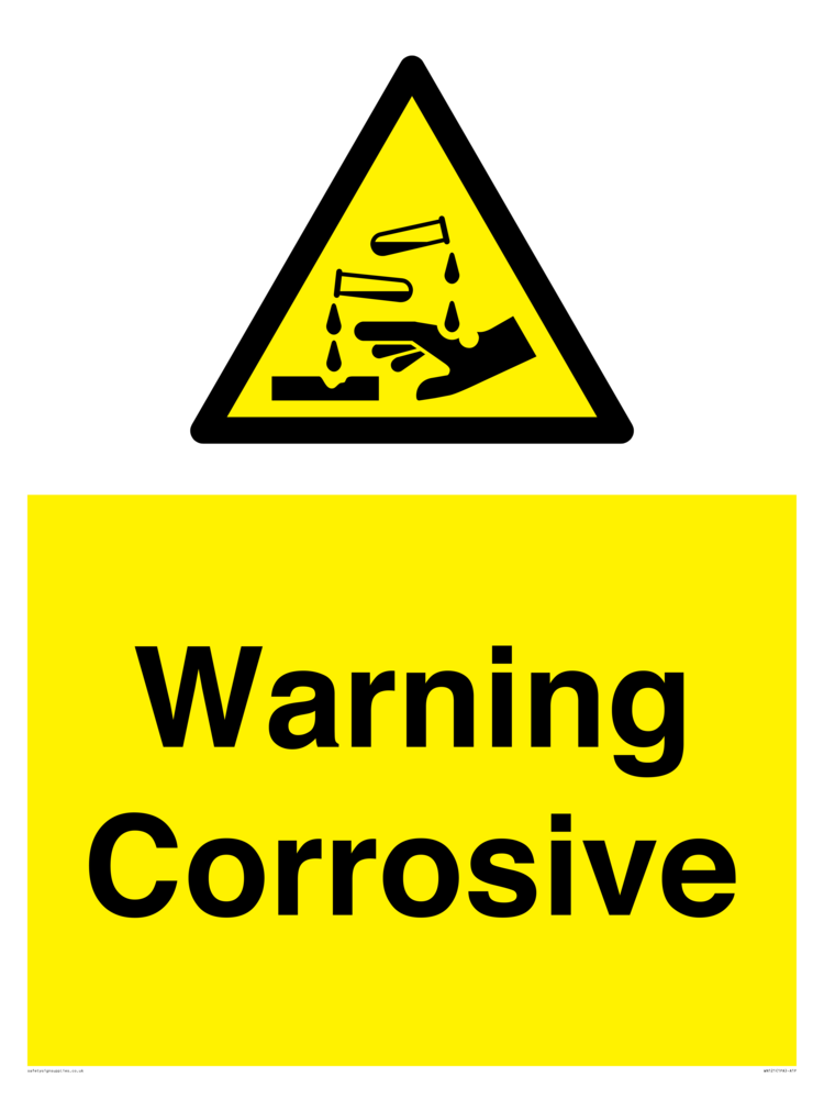 This sign contains an international standard corrosive warning symbol. Bar and hand damaged by substance dripping from test tubes in black on a yellow warning triangle with black border.