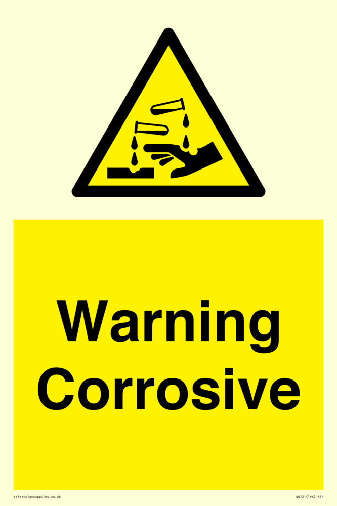 This sign contains an international standard corrosive warning symbol. Bar and hand damaged by substance dripping from test tubes in black on a yellow warning triangle with black border.