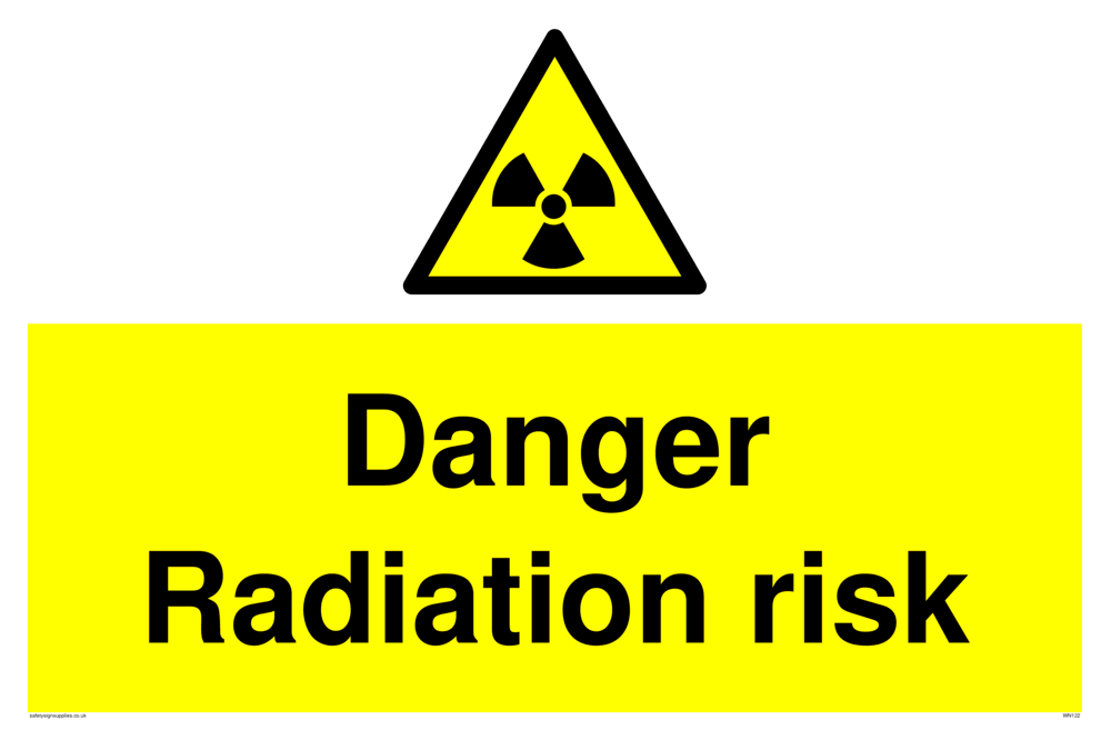 This sign contains an international standard radiation hazard symbol. A trefoil in black on a yellow warning triangle with black border.