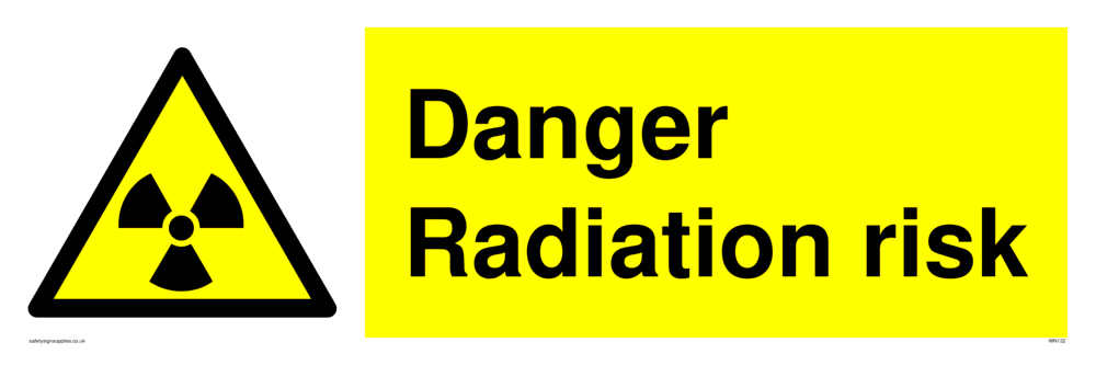 This sign contains an international standard radiation hazard symbol. A trefoil in black on a yellow warning triangle with black border.