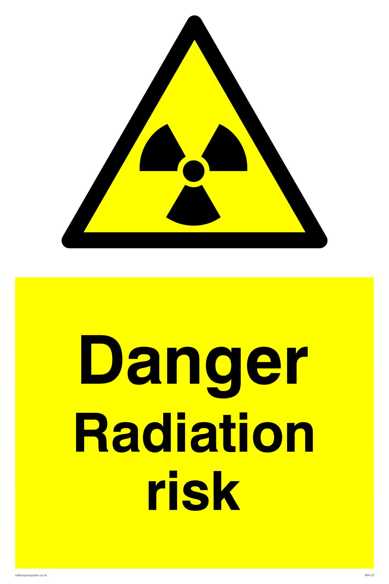 This sign contains an international standard radiation hazard symbol. A trefoil in black on a yellow warning triangle with black border.