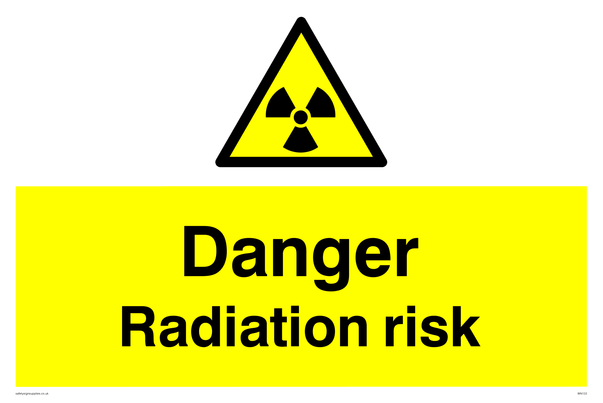 This sign contains an international standard radiation hazard symbol. A trefoil in black on a yellow warning triangle with black border.