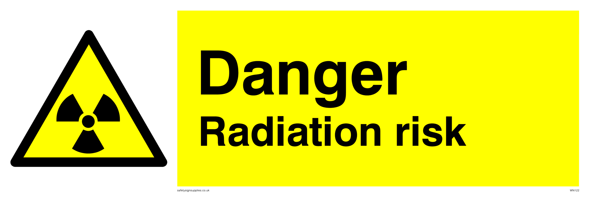 This sign contains an international standard radiation hazard symbol. A trefoil in black on a yellow warning triangle with black border.