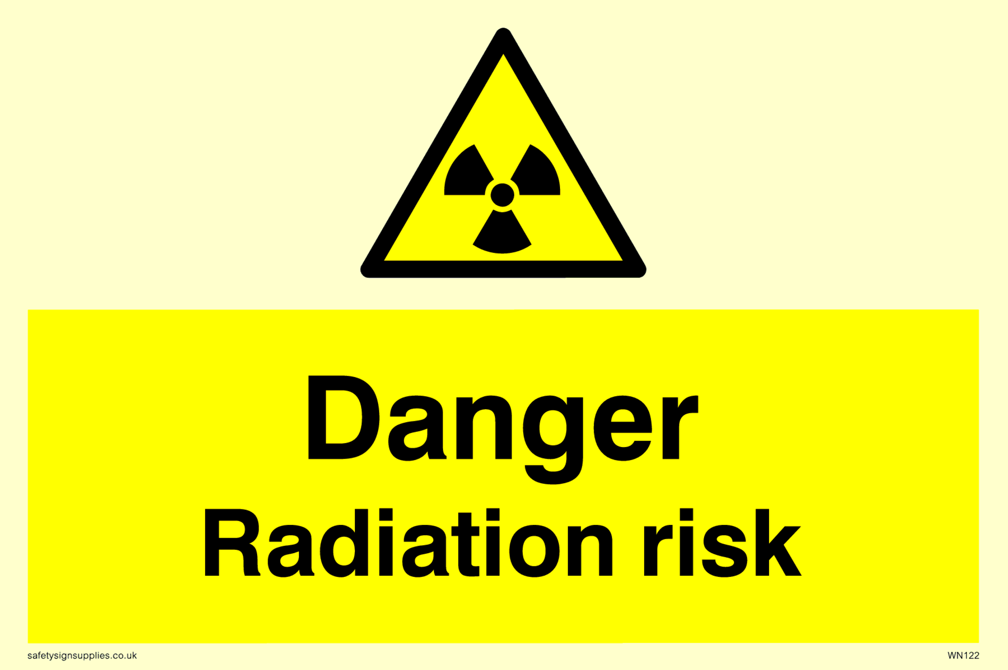 This sign contains an international standard radiation hazard symbol. A trefoil in black on a yellow warning triangle with black border.