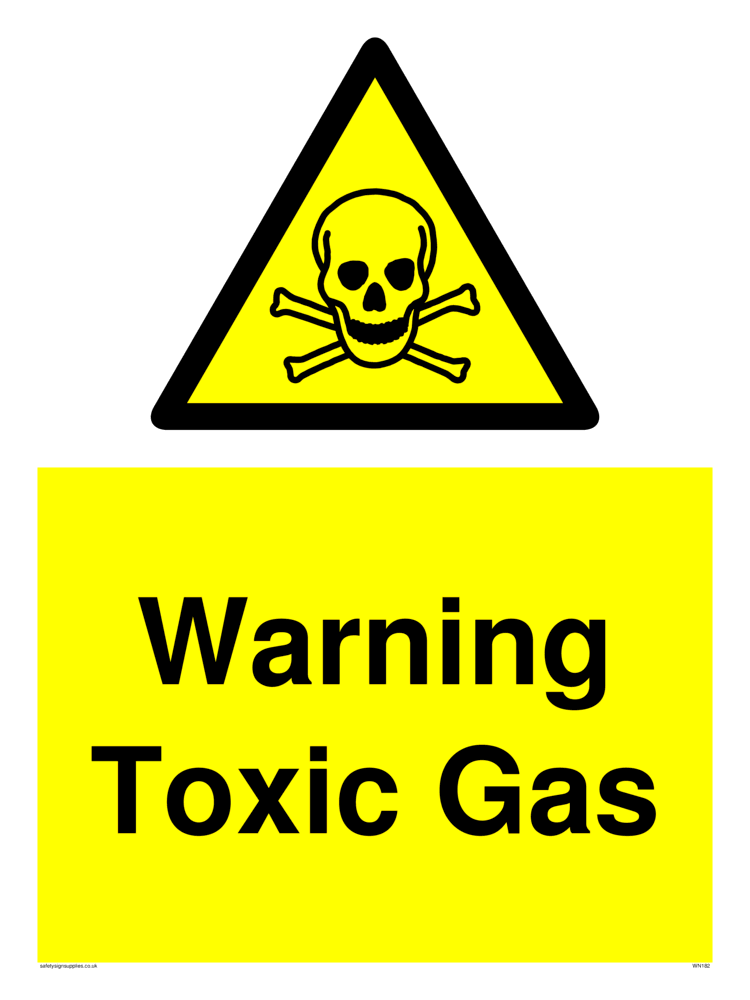 This sign contains an international standard toxic / poison symbol. Skull and cross bones in black on yellow warning triangle with black border.