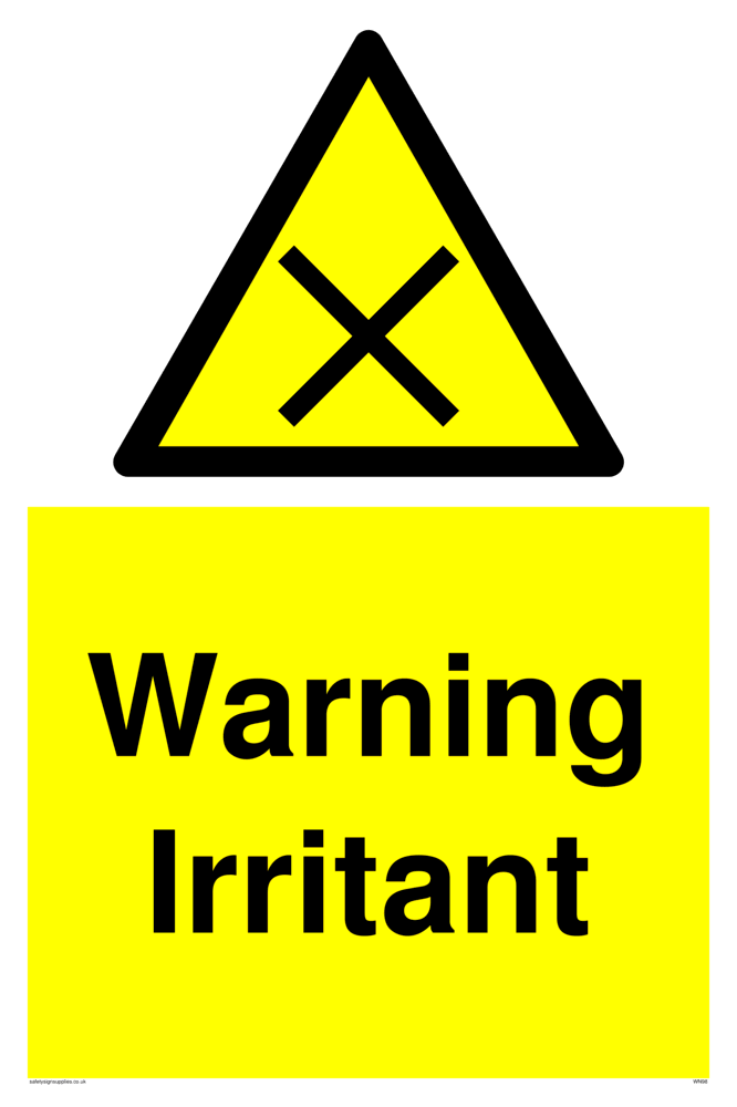 This sign contains an international standard irritant / harmful warning symbol. Diagonal black cross in yellow warning triangle with black border. Comes with a self adhesive backing.