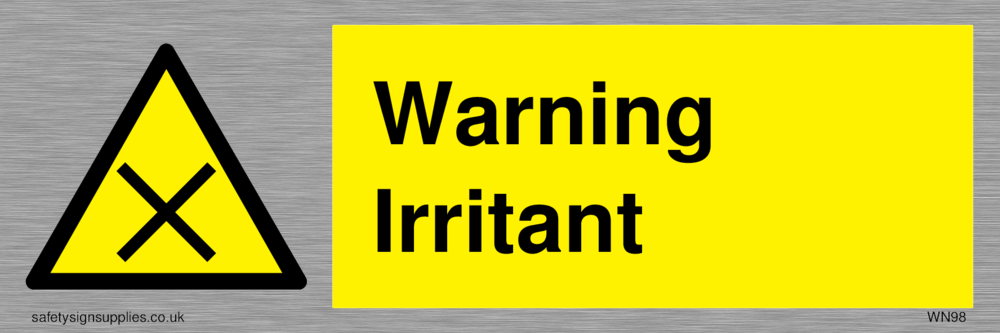 This sign contains an international standard irritant / harmful warning symbol. Diagonal black cross in yellow warning triangle with black border.