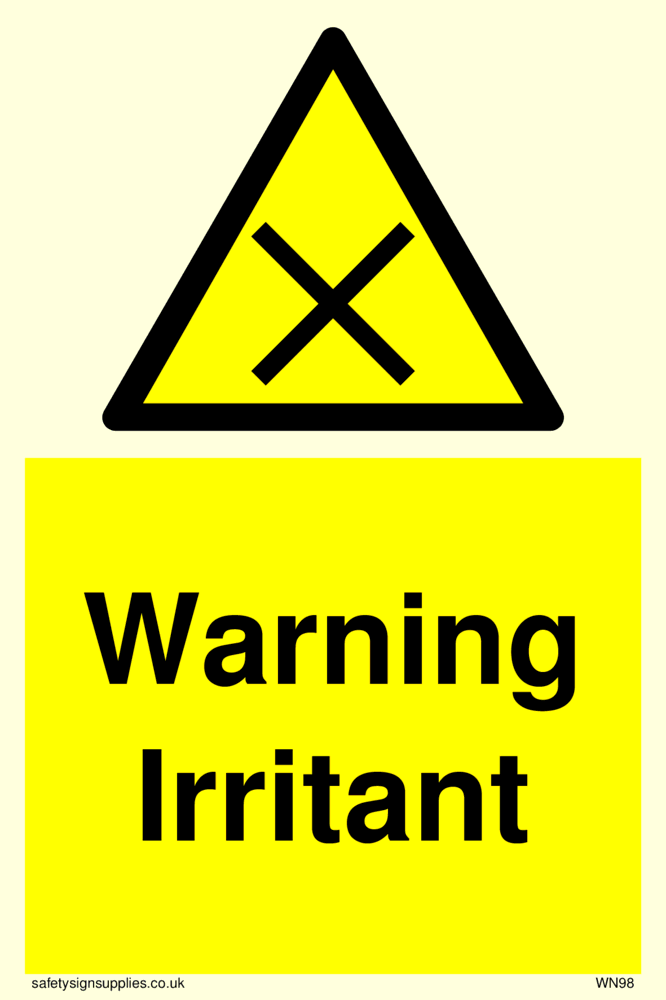 This sign contains an international standard irritant / harmful warning symbol. Diagonal black cross in yellow warning triangle with black border. Comes with a self adhesive backing.