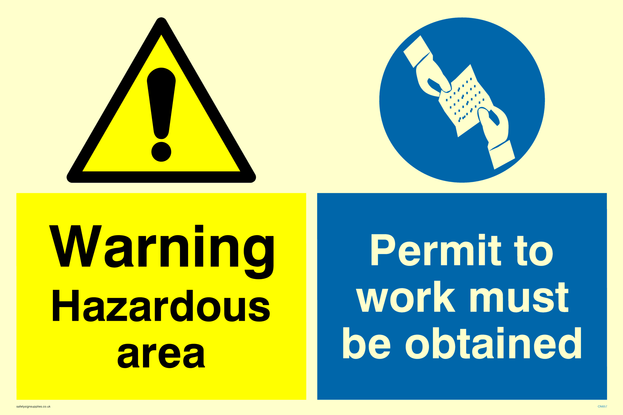 This sign contains a permit required symbol - permit / paper being passed from hand to hand in white within blue circle. This sign contains a warning Exclamation Symbol - black exclamation mark on yellow triangle background. Comes with a self adhesive backing.