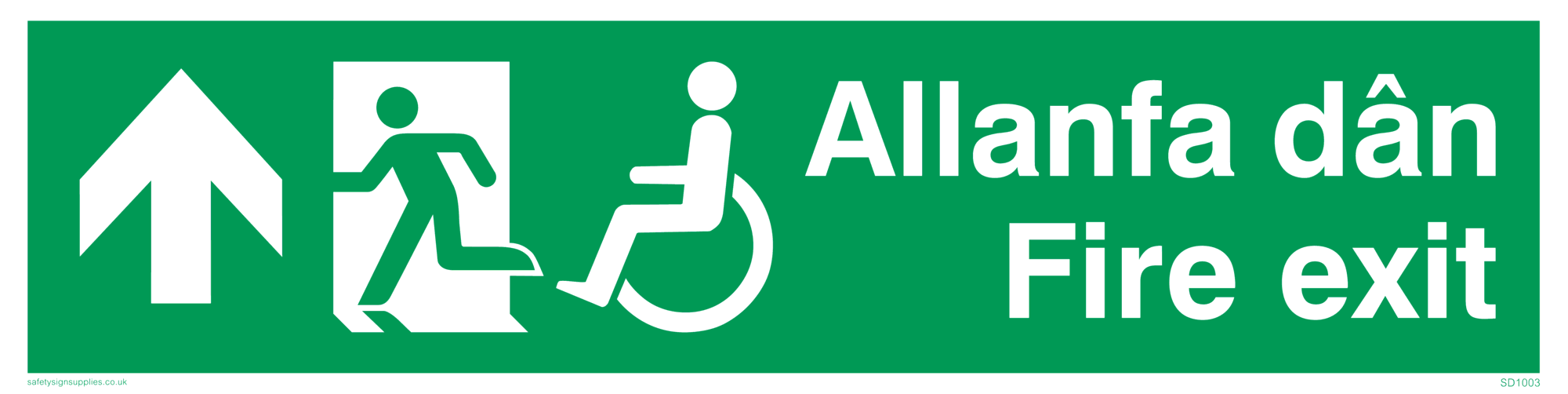 This sign contains a disabled man on exit facing left symbol - disabled person in wheelchair in green on exit in white.