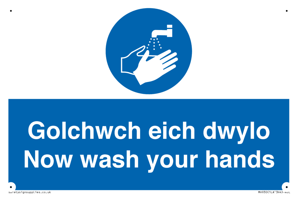 bi-lingual sign - welsh / english with hand wash symbol